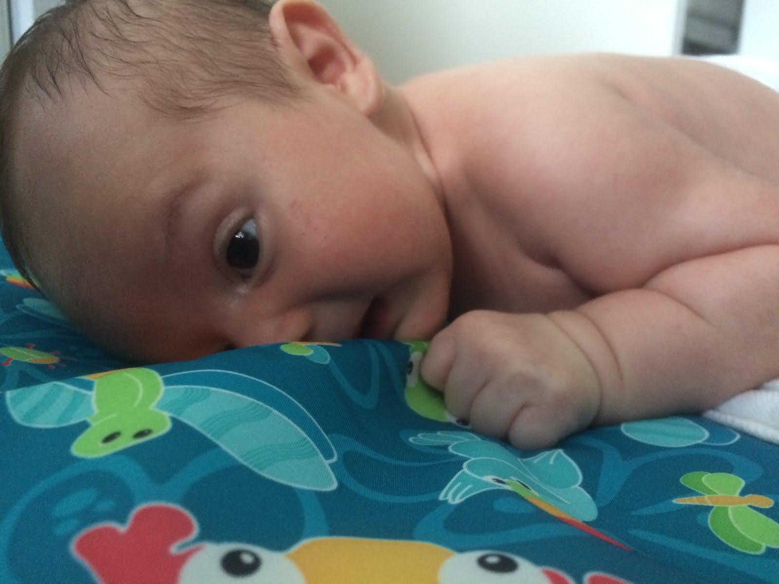 After reading a section about tummy time in one of the many baby books that people have given us, we decided to introduce Gordy to the concept. He tolerated it for about 1 minute before starting to fuss, which we think wasn't a bad first effort.